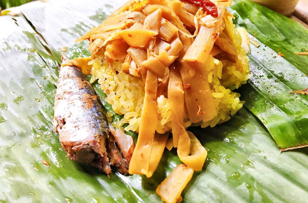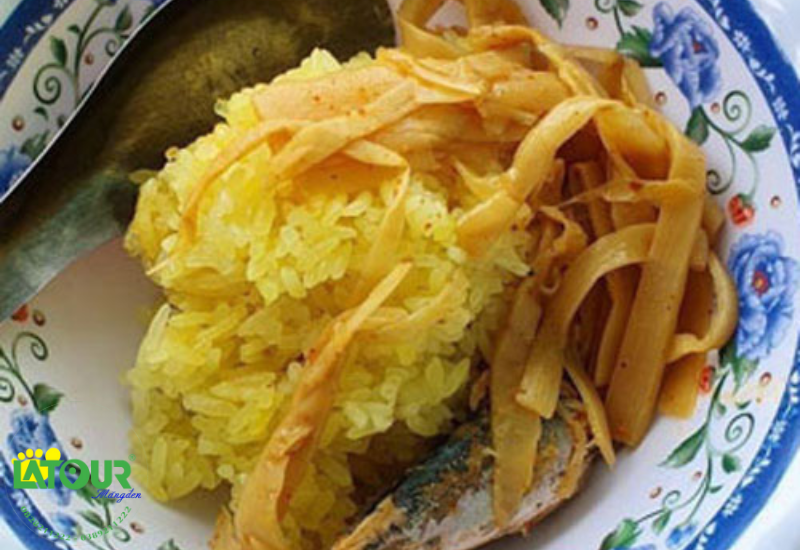 | Nguyên liệu chính | Gạo nếp dẻo vàng, măng le rừng tươi xào chua cay, cá nục kho sệt |